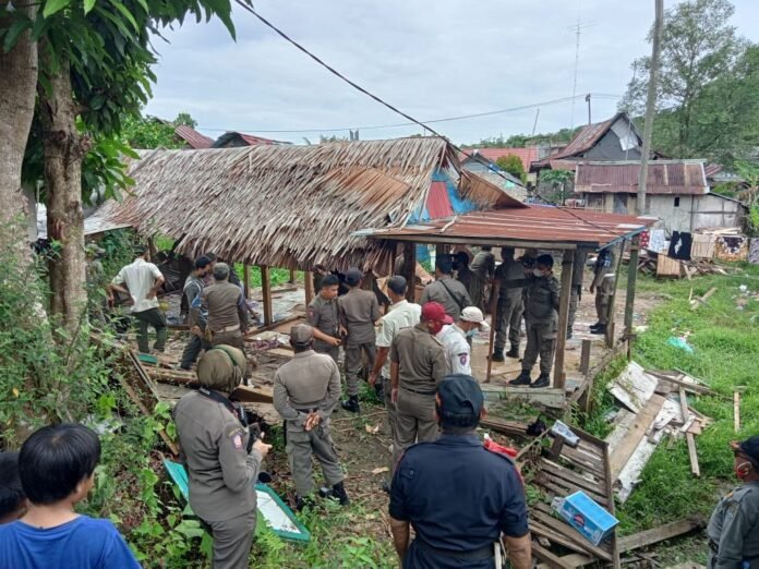 Sulawesi Barat – Sebanyak 100 personil Satuan Polisi Pamong Praja (Satpol PP) membongkar puluhan rumah warga di belakang Stadion Manakarra, Kelurahan Binanga, Kecamatan Mamuju, Kabupaten Mamuju, Sulawesi Barat (Sulbar).