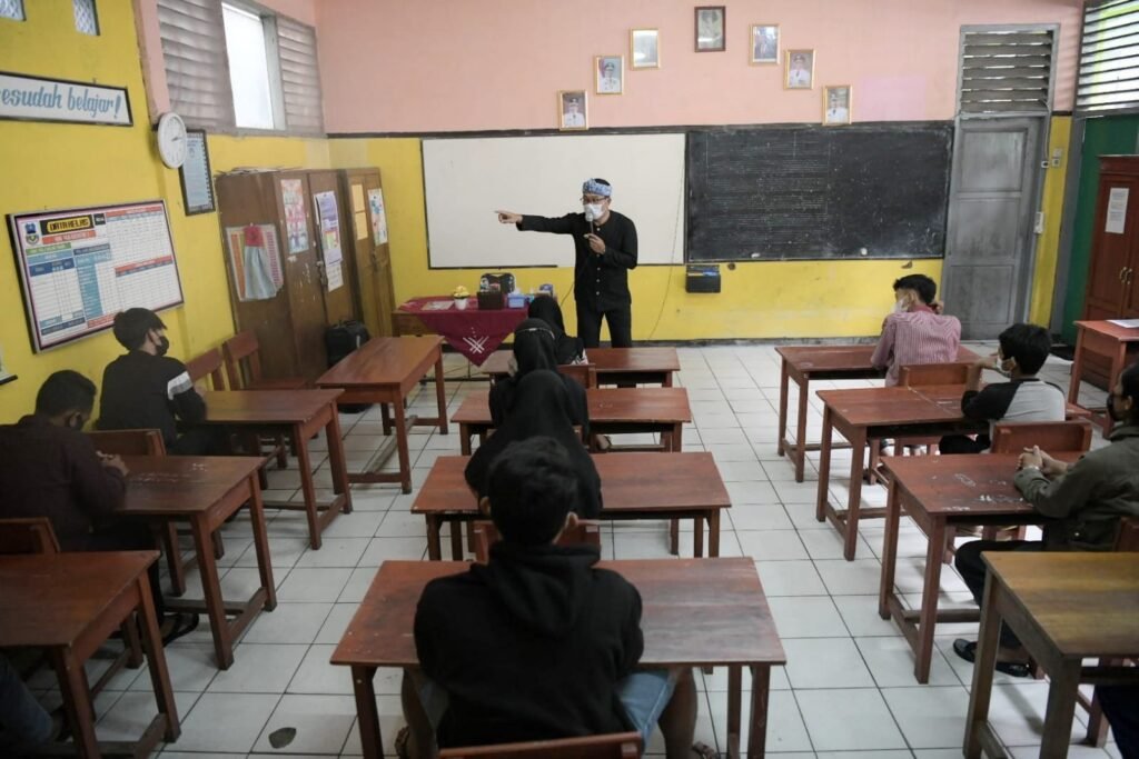 Garut – Gubernur Jawa Barat Ridwan Kamil memberikan edukasi kebangsaan kepada 20 warga yang terpapar paham Negara Islam Indonesia (NII), di SDN Sukamentri 3-4-5 Garut, Desa Sukamentri, Kecamatan Garut Kota, Kabupaten Garut, Sabtu 11 Desember 2021.