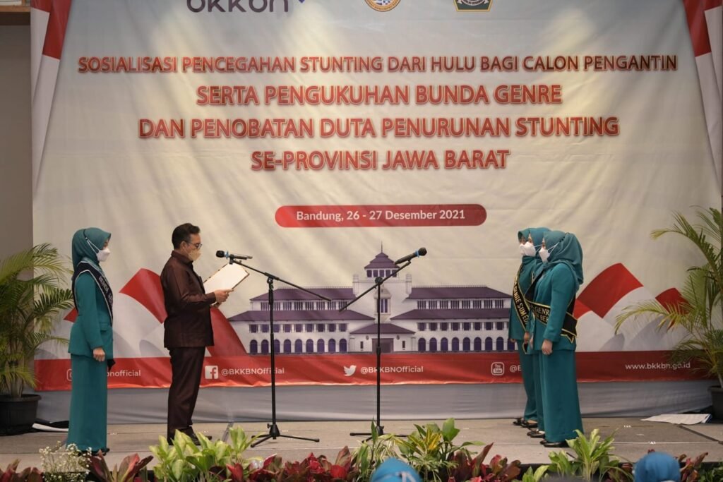 Bandung – Bunda Genre Provinsi Jawa Barat (Jabar) Atalia Praratya Ridwan Kamil dikukuhkan sebagai Duta Penurunan Stunting Provinsi Jabar oleh Kepala Badan Kependudukan dan Keluarga Berencana Nasional (BKKBN) Pusat Hasto Wardoyo di Hotel Aston, Kota Bandung, Senin 27 Desember 2021.