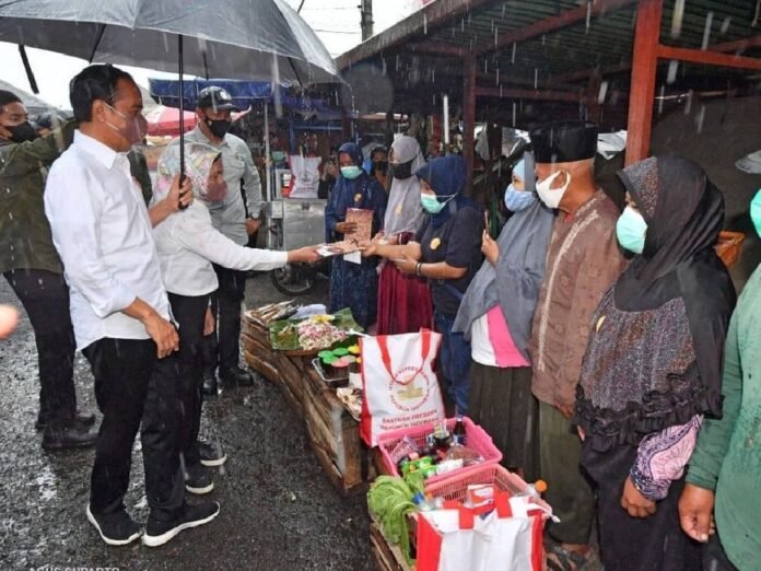 Jakarta – Presiden Joko Widodo atau Jokowi beserta Ibu Negara Iriana Joko Widodo mengunjungi Pasar Kertek, Kabupaten Wonosobo, Jawa Tengah, Selasa, 14 Desember 2021.