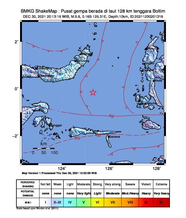 “Gempa Mag:5.6, 30-Des-21 20:13:16 WIB, Lok:0.16 LS, 125.31 BT (Pusat gempa berada di laut 128 km tenggara Boltim), Kedlmn:10 Km” demikian dikutip Opsi dari akun Twitter BMKG pada Kamis 30 Desember 2021.