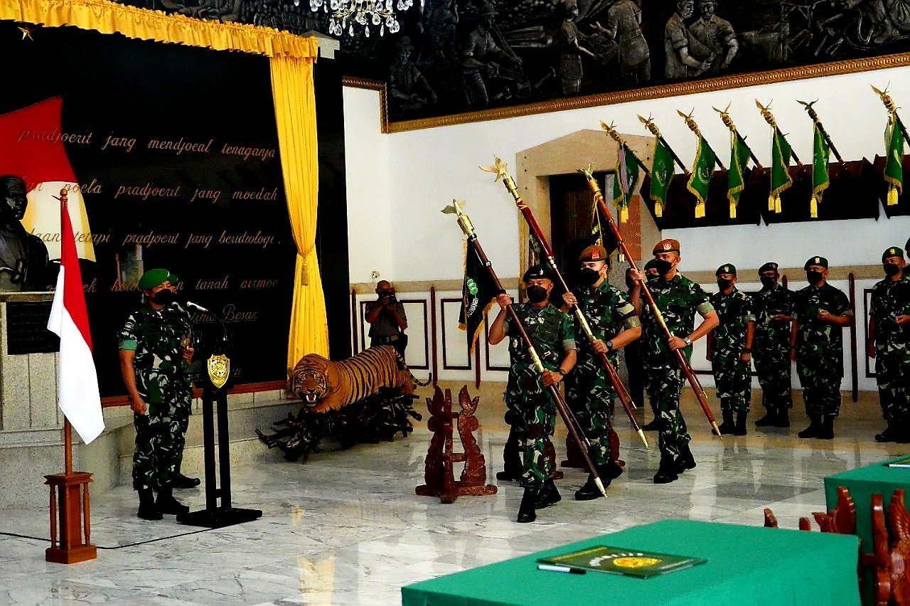 Pangdam III/Siliwangi Mayjen TNI Agus Subiyanto didampingi Ketua Persit KCK Daerah III/Slw memimpin langsung acara serah terima jabatan yang berlangsung bersamaan dengan wisuda purnawira, dan pemberian penghargaan program vaksinasi Ruang Silihwangi Makodam III/Slw, Jalan Aceh No. 69 Kota Bandung Jabar, Senin 3 Januari 2022.