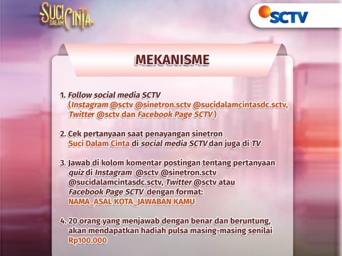Jakarta – Stasiun televisi SCTV memberikan hadiah kepada para penonton setia sinetron Suci Dalam Cinta dengan jumlah total senilai Rp 20 juta. Hadiah diberikan dengan syarat dan ketentuan yang telah ditetapkan dan dapat diikuti seluruh masyarakat Indonesia.