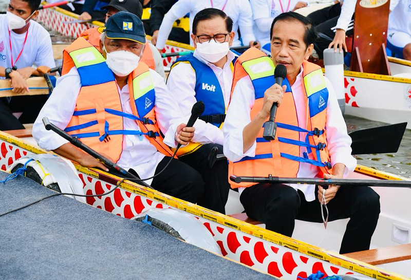 Presiden Jokowi didampingi Menteri Pekerjaan Umum dan Perumahan Rakyat (PUPR) Basuki Hadimuljono dan Sekretaris Kabinet Pramono Anung menjadi pendayung perahu naga.