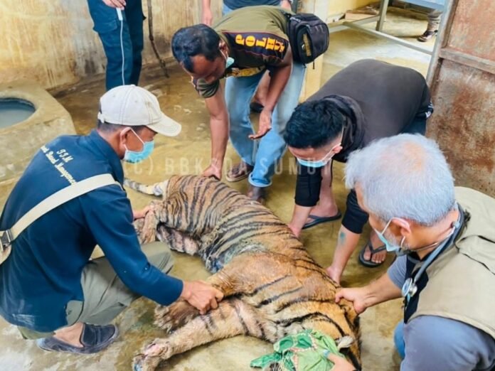 Medan – Seekor Harimau Sumatera yang masuk ke dalam perangkap jebak di Kabupaten Padang Lawas, Sumatera Utara, diberi nama penandaan Dewi Siundol .
