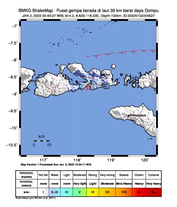 Jakarta – Kabupaten Dompu Provinsi Nusa Tenggara Barat (NTB) diguncang gempa berkekuatan magnitudo 4.2 pada Minggu 2 Januari 2022 pukul 21.45 Wita.