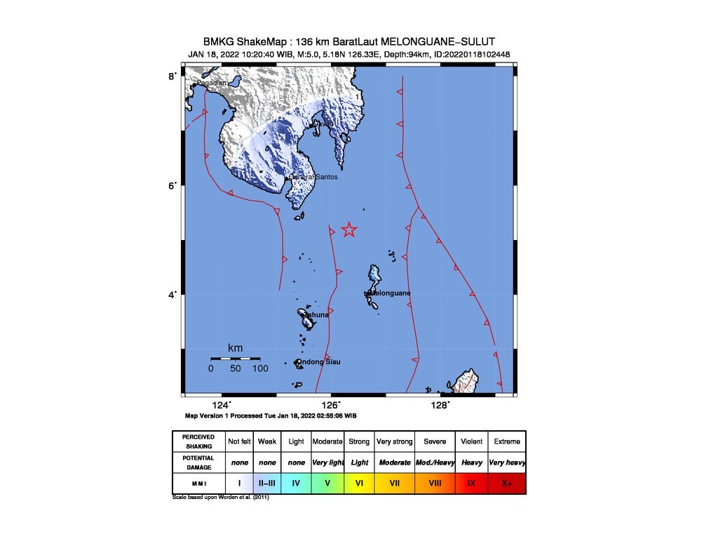 “#Gempa Magnitudo: 5.0, Kedalaman: 94 km, 18 Jan 2022 10:20:40 WIB, Koordinat: 5.18 LU-126.33 BT (136 km BaratLaut MELONGUANE-SULUT), Tidak berpotensi tsunami #BMKG,” cuit akun resmi BMKG di Twitter, dikutip Opsi pada Selasa, 18 Januari 2022.