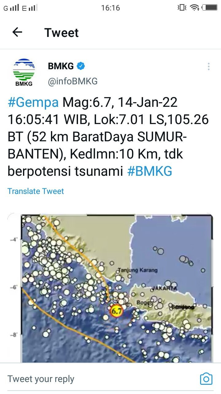 Dalam unggahan di Twitter @infoBMKG, diinformasikan bahwa Gempa 6,7 M berada di kedalaman 10 kilometer, terjadi pada Jumat, 14 Januari 2022 sekitar pukul 16.05.41 WIB.