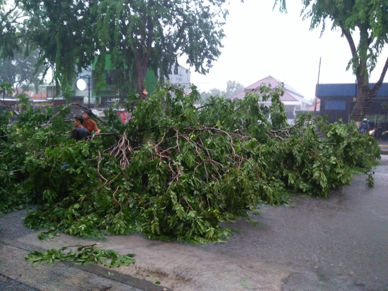 Akibat kejadian tersebut satu pohon di jalan Cipto Mangunkusumo Kecamatan Kesambi tumbang dan menimpa satu tukang ojek online yang sedang melintas di jalan tersebut.