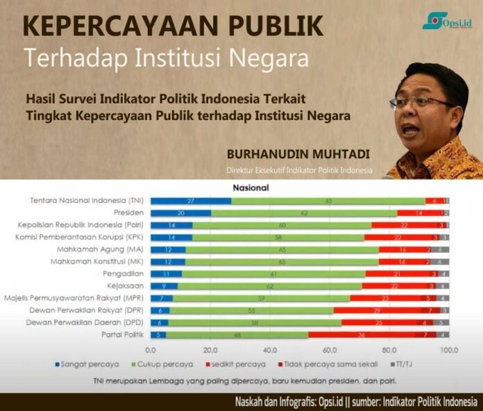 Jakarta – Hasil survei Indikator Politik Indonesia tentang tingkat kepercayaan publik terhadap institusi negara memperlihatkan bahwa kepercayaan tertinggi dipegang oleh TNI. Sedangkan Polri mengalami penurunan sebanyak 6 persen.