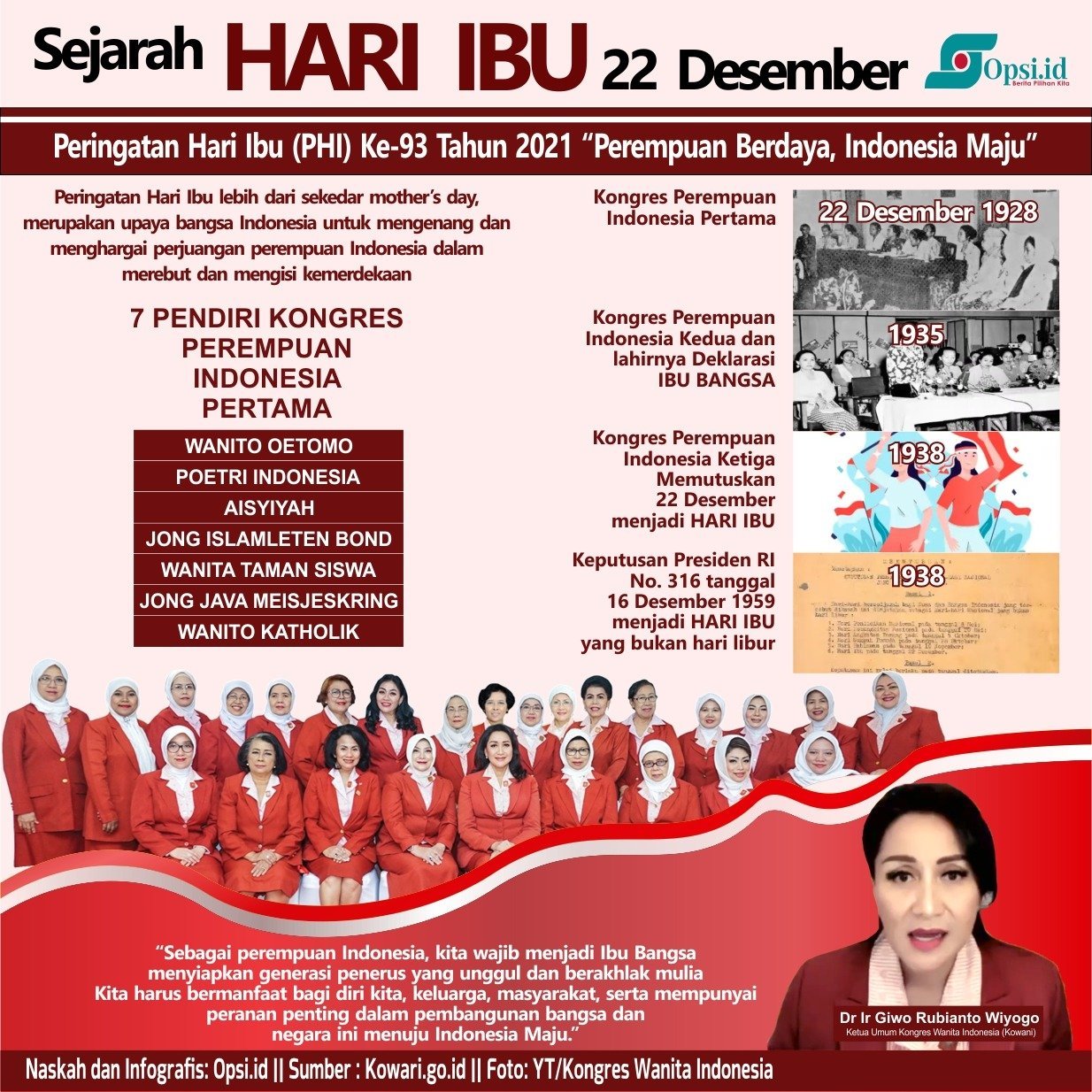 Pada Kongres Perempoean Indonesia Kedua Tahun 1935 di Jakarta, lahir deklarasi “Ibu Bangsa”. Selanjutanya Pada Kongres Tahun 1938 di Bandung diputuskan 22 Desember menjadi “Hari Ibu”. Keputusan ini kemudian tetapkan dengan Keputusan Presiden RI No. 316 tanggal 16 Desember 1959 menjadi Hari Nasional yang bukan hari libur. []