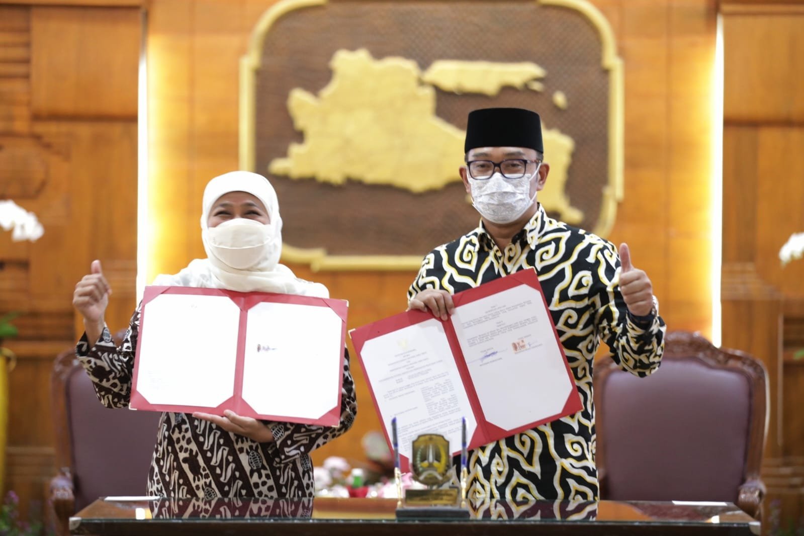 Penandatanganan kesepakatan bersama dilakukan langsung oleh Gubernur Jabar Ridwan Kamil dan Gubernur Jatim Khofifah Indar Parawansa di Gedung Grahadi Surabaya, Kamis 20 Januari 2022.