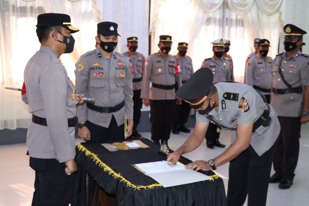 Aceh Barat Daya – Kapolres Aceh Barat Daya (Abdya) Ajun Komisari Besar Polisi (AKBP) Muhammad Nasution, memimpin upacara serah terima jabatan (Sertijab) Kabag Ops dan Kapolsek Blangpidie di Aula Mapolres, Jumat 18 Februari 2022.