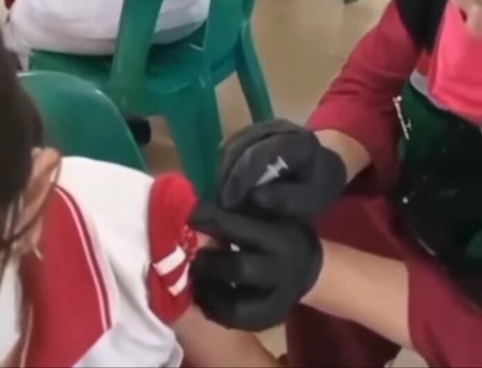 Dalam video yang beredar luas di jejaring media sosial ini, terlihat seorang wanita petugas vaksin berhadapan dengan lengan sebelah kiri seorang siswi SD.