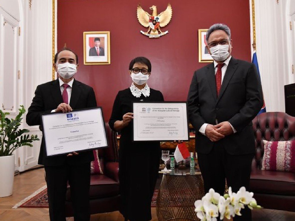 Jakarta – Menlu Retno Marsudi secara resmi menerima sertifikat asli penetapan Pantun dan Gamelan sebagai Warisan Tak Benda dari UNESCO, Senin, 21 Februari 2022.