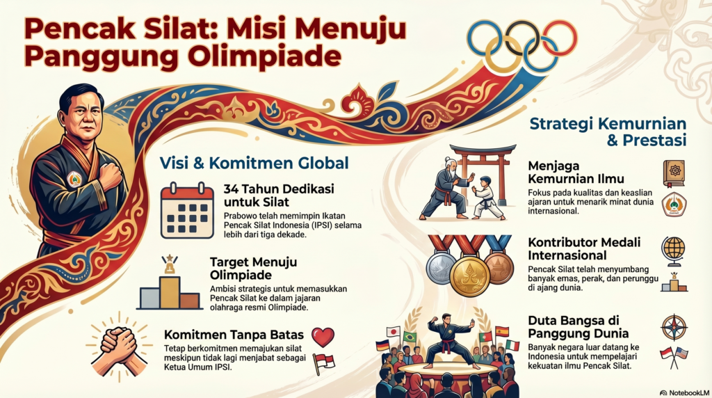 Jakarta – Presiden Prabowo Subianto yang sudah hampir 34 tahun bergelut sebagai pimpinan di Ikatan Pencak Silat Indonesia (IPSI), bermimpi olahraga pencak silat bisa tembus di Olimpiade.