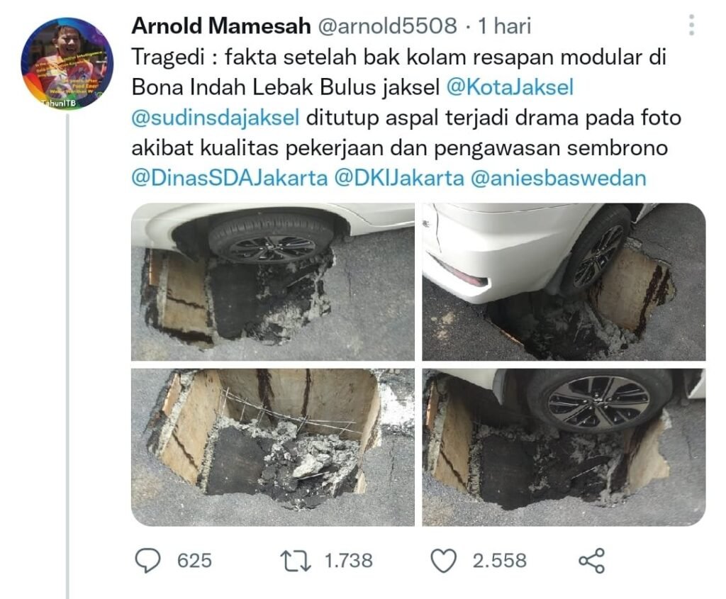 “Tragedi: fakta setelah bak kolam resapan modular di Bona Indah Lebak Bulus Jaksel ditutup aspal, terjadi drama (seperti) pada foto akibat kualitas pekerjaan dan pengawasan sembrono,” cuit Arnold menandai akun Twitter Anies Baswedan.