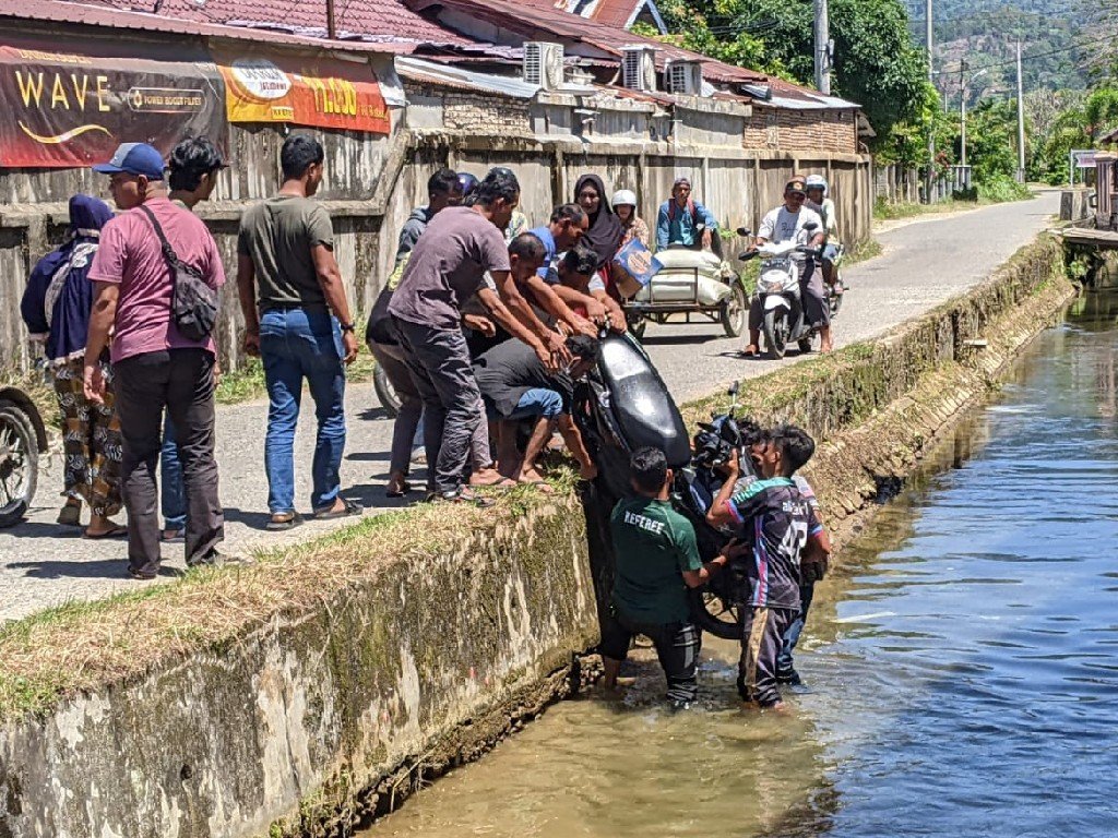 “Karena muncul tiba-tiba dari persimpangan, kemudian ibu itu kaget. Motornya oleng dan masuk dalam irigasi ini,” kata Rahmat, salah satu warga yang membantu mengevakuasi motor dan korban, Minggu, 20 Februari 2022.