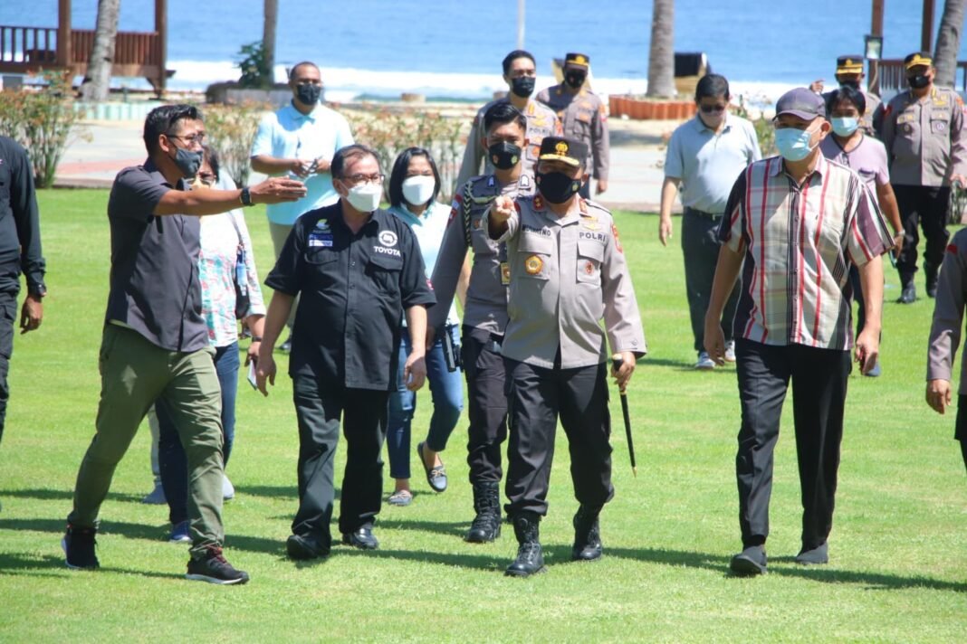 Manado – Kapolda Sulut Irjen Pol Mulyatno meninjau langsung kesiapan lokasi kegiatan side event Women20 atau W20 Indonesia 2022, di Paradise Hotel Golf & Resort, Likupang, Minahasa Utara (Minut), pada Sabtu 12 Februari 2022.