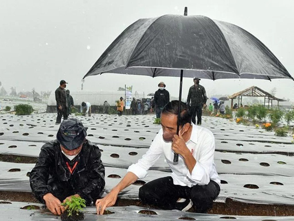 Jakarta – Presiden Joko Widodo atau Jokowi menanam cabai saat guyuran hujan deras menerjang lumbung pangan (food estate) di Desa Lamuk, Kecamatan Kalijajar, Kabupaten Wonosobo, Jawa Tengah, Selasa, 14 Desember 2021.