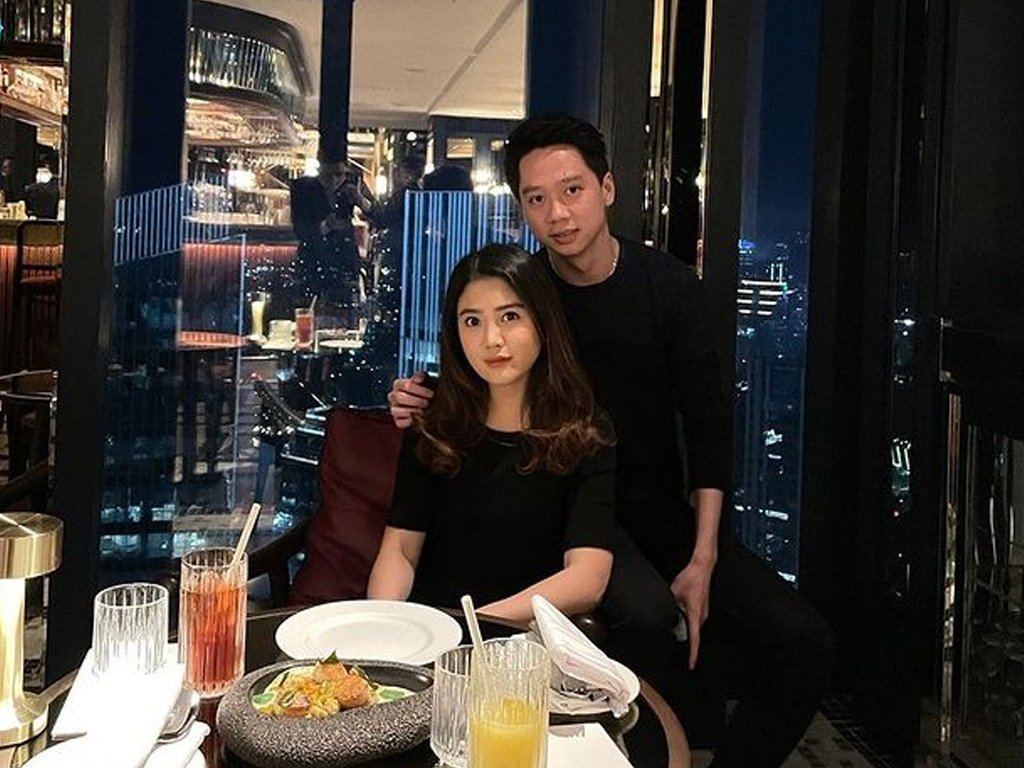 Kevin Sanjaya dan Valencia Tanoesoedibjo nampak serasi mengenakan pakaian dengan dominasi warna hitam. Keduanya, berpose bersama di sebuah restoran mewah.