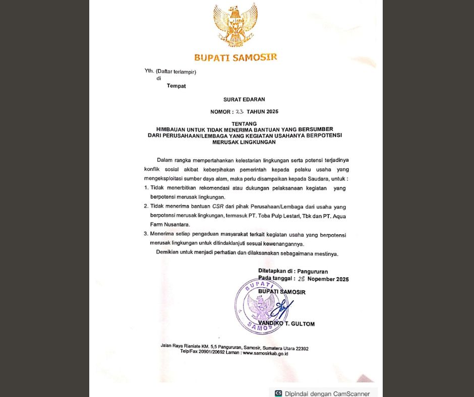 "Pemerintah Kabupaten Samosir menerbitkan Surat Edaran Nomor 23 Tahun 2025 tanggal 28 November 2025 terkait Himbauan untuk tidak menerima bantuan yang bersumber dari Perusahaan/lembaga yang kegiatan usahanya berpotensi merusak lingkungan. Surat Edaran ini ditujukan kepada seluruh pimpinan Organisasi Perangkat Daerah (OPD), Camat dan Kepala Desa se-Kabupaten Samosir," demikian postingan yang menyertakan surat dimaksud dan beredar luas di media sosial.