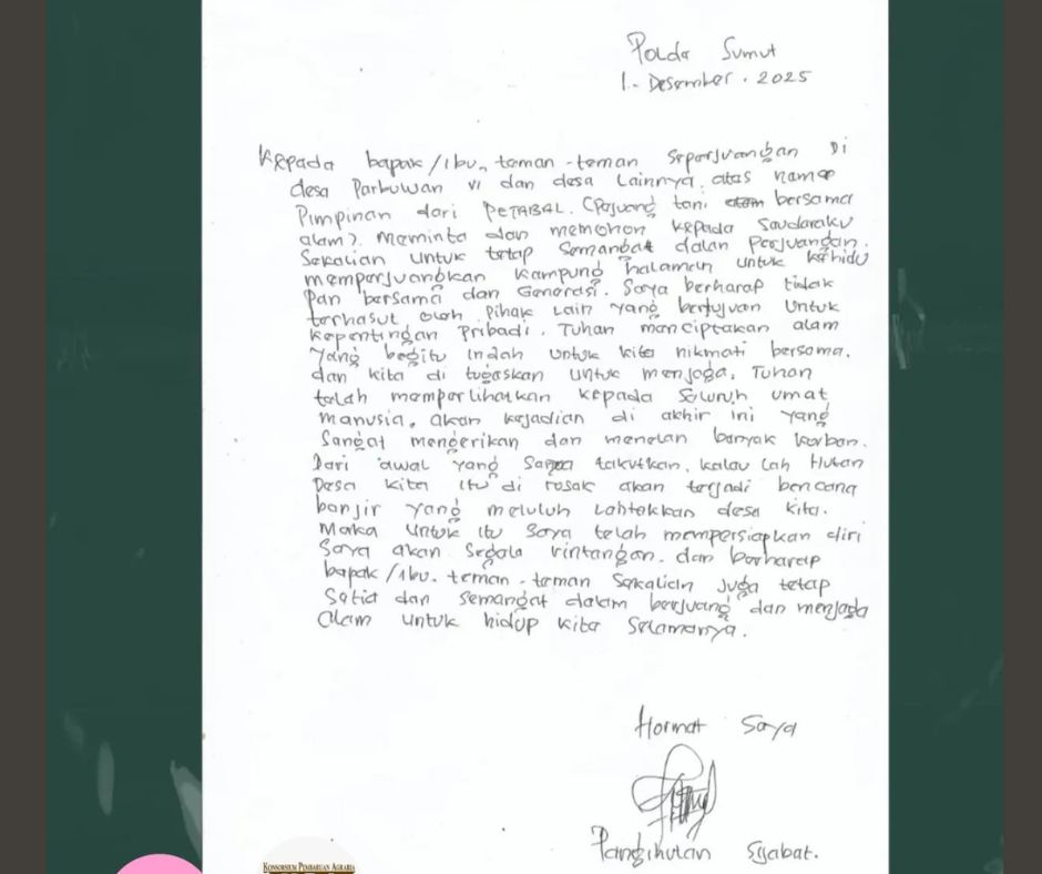 Dari balik jeruji besi alias tahanan polisi Polda Sumut, pada 1 Desember 2025, Pangihutan mengirimkan surat dalam bentuk tulisan tangan kepada rekan-rekannya di Dairi, Sumatra Utara.