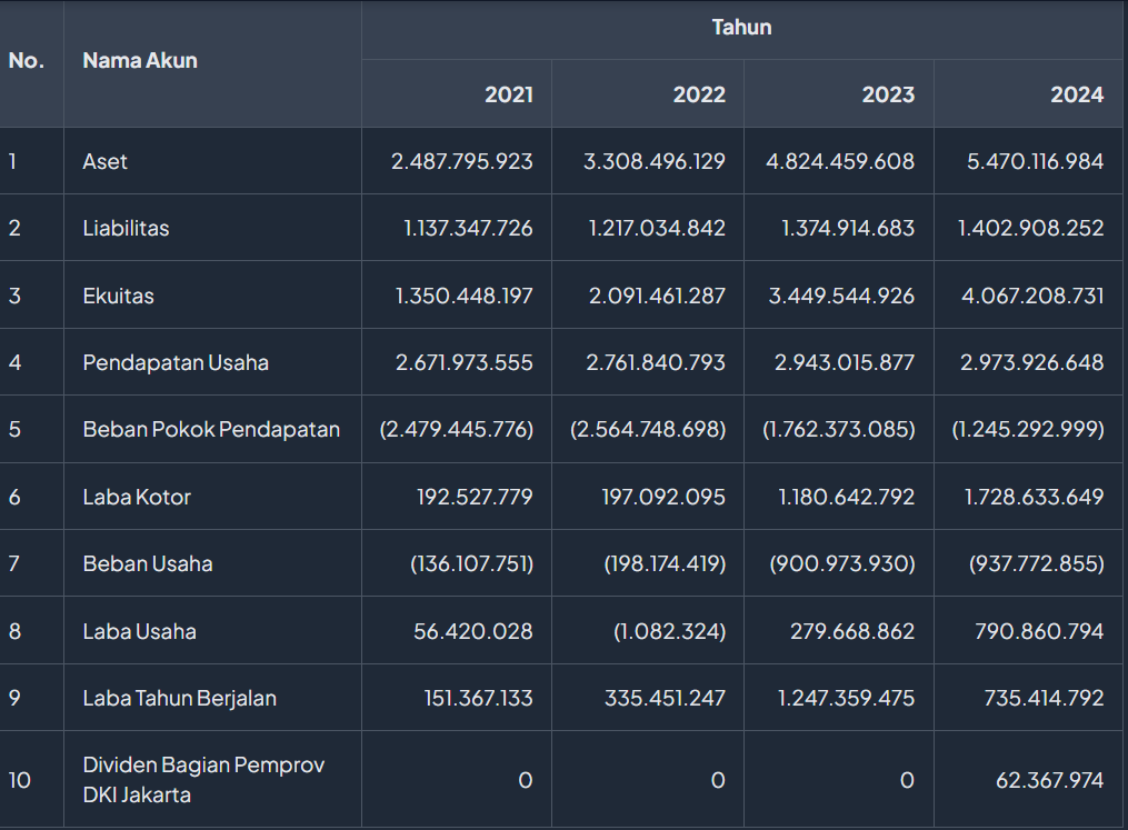 Adapun laba tahun berjalan menunjukkan kinerja yang relatif solid. Pada 2022, PAM Jaya membukukan laba tahun berjalan sebesar Rp335,4 juta. Laba tersebut meningkat tajam pada 2023 menjadi Rp1,24 miliar, sebelum anjlok di level Rp735 juta pada tahun 2024.