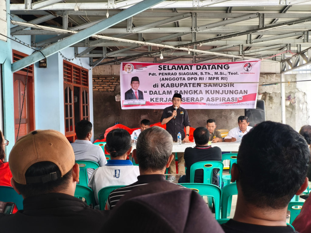 Samosir - Anggota DPD RI Pdt. Penrad Siagian menemui masyarakat Samosir pengguna dan pengelola tanah eks Belanda atau Gemeente di Sekretariat Forum Komunikasi Masyarakat Tanah Eks Penguasaan Belanda Kecamatan Pangururan, Sabtu, 18 Oktober 2025.