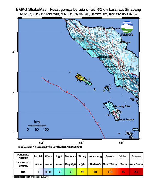 Gempa terjadi pada 27 November 2025 pukul 11:56:24 WIB.