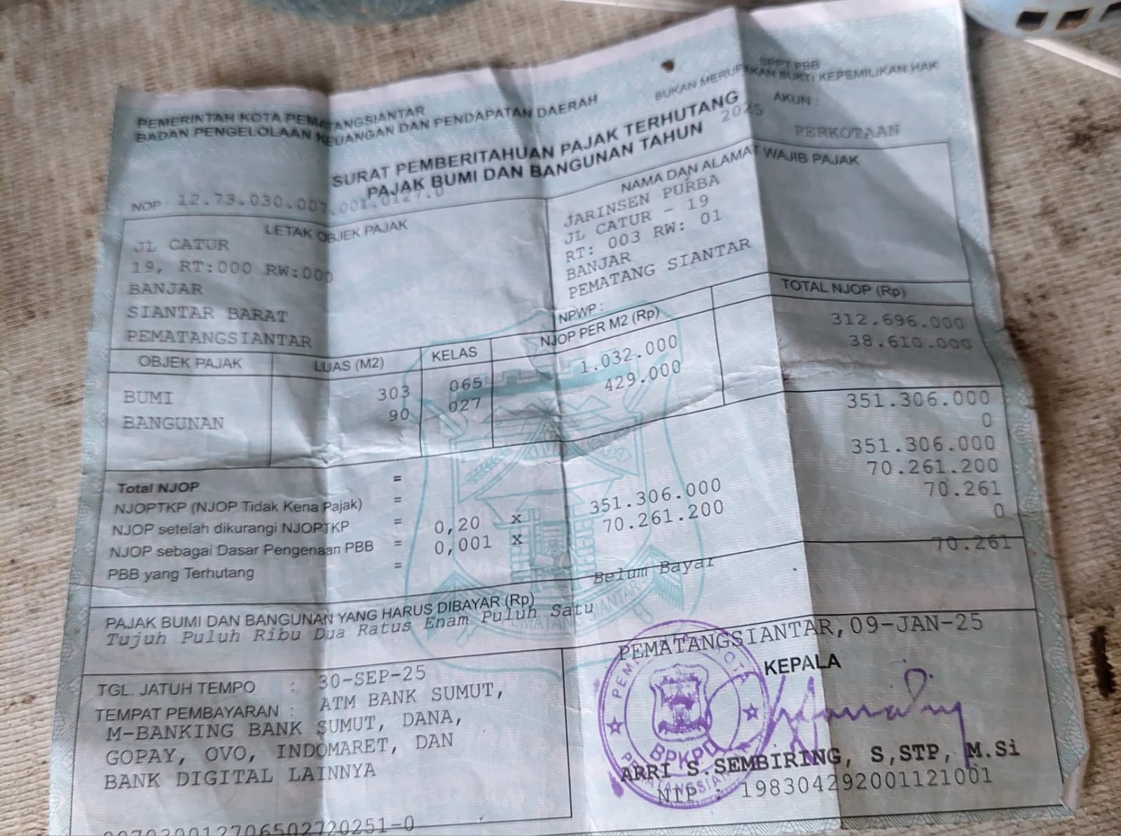 SPPT Pajak Bumi dan Bangunan milik seorang warga Jalan Catur, Kelurahan Banjar, Kecamatan Siantar Barat, Kota Pematangsiantar, Sumatra Utara. (Foto: Ist)