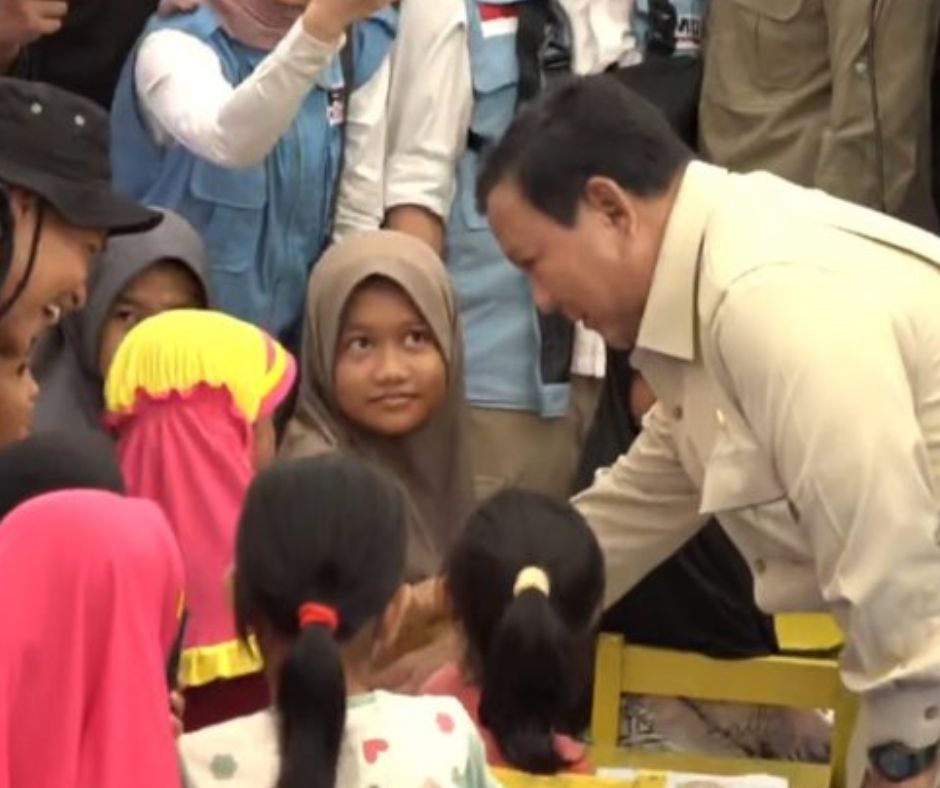 Prabowo meninjau posko trauma healing. Presiden berinteraksi, berbincang, dan memberikan semangat kepada anak-anak pengungsi.