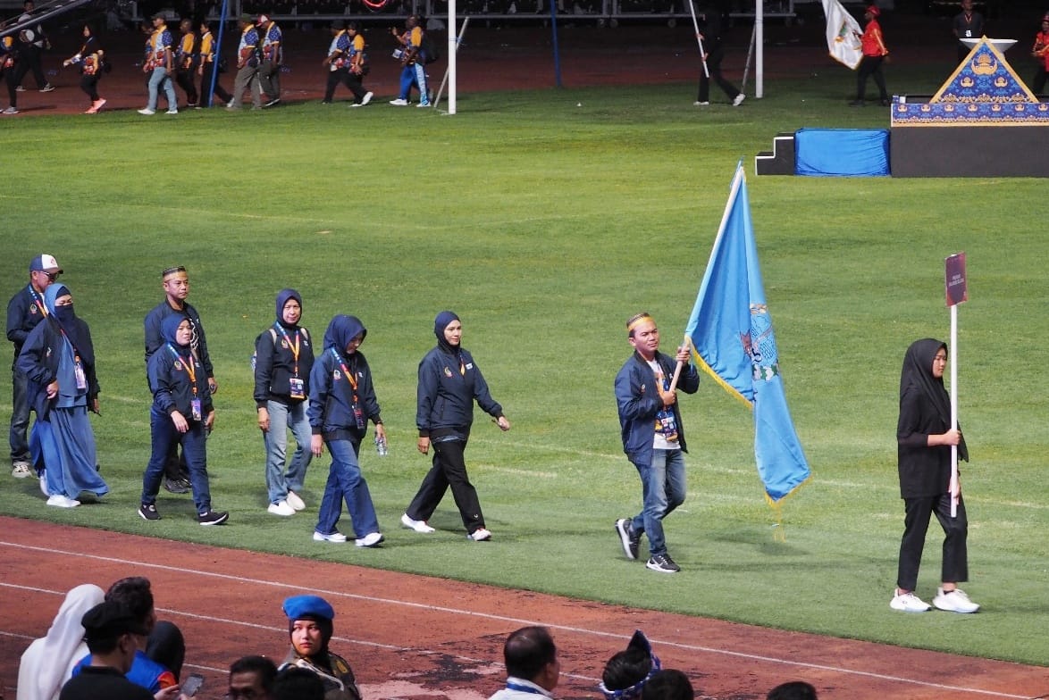 Kontingen Sulsel tampil khas dengan mengenakan songkok Recca, warisan budaya tak benda yang melambangkan kebanggaan, kebijaksanaan.