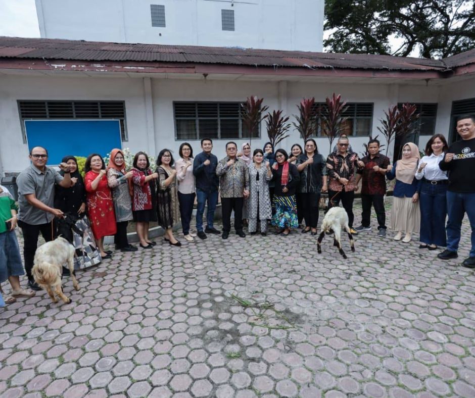 Pematangsiantar - Wali Kota Pematangsiantar Wesly Silalahi SH MKn bersama Ketua TP PKK Ny Liswati Wesly Silalahi menyerahkan bantuan berupa kambing kepada pemenang Lomba Dalam Rangka Hari Kesatuan Gerak (HKG) PKK Tingkat Provinsi Sumatera Utara (Sumut) Tahun 2025.