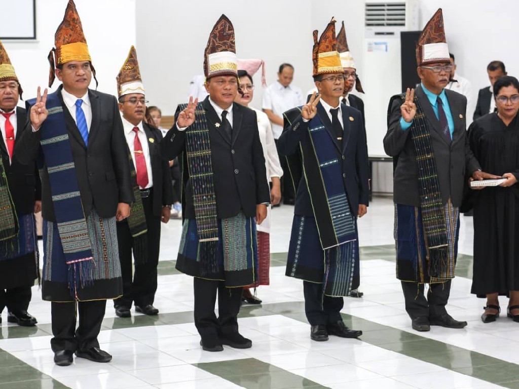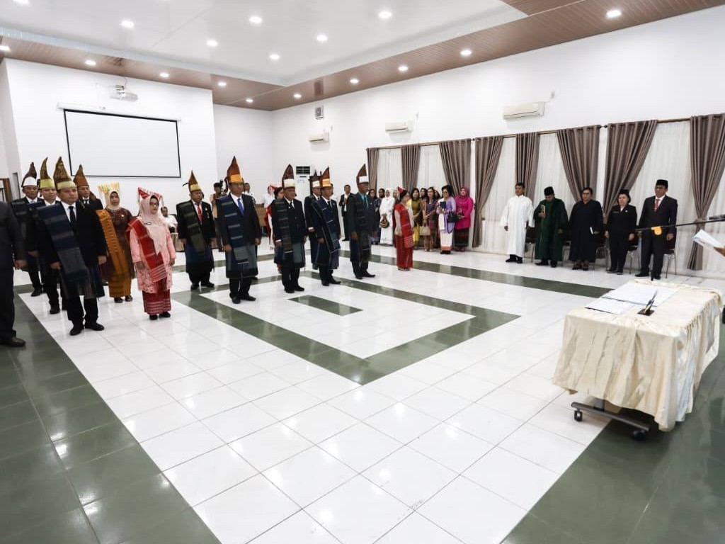 Junaedi serta para pejabat yang dilantik secara langsung mengenakan pakaian adat Simalungun, lengkap dengan gotong dan bulang.