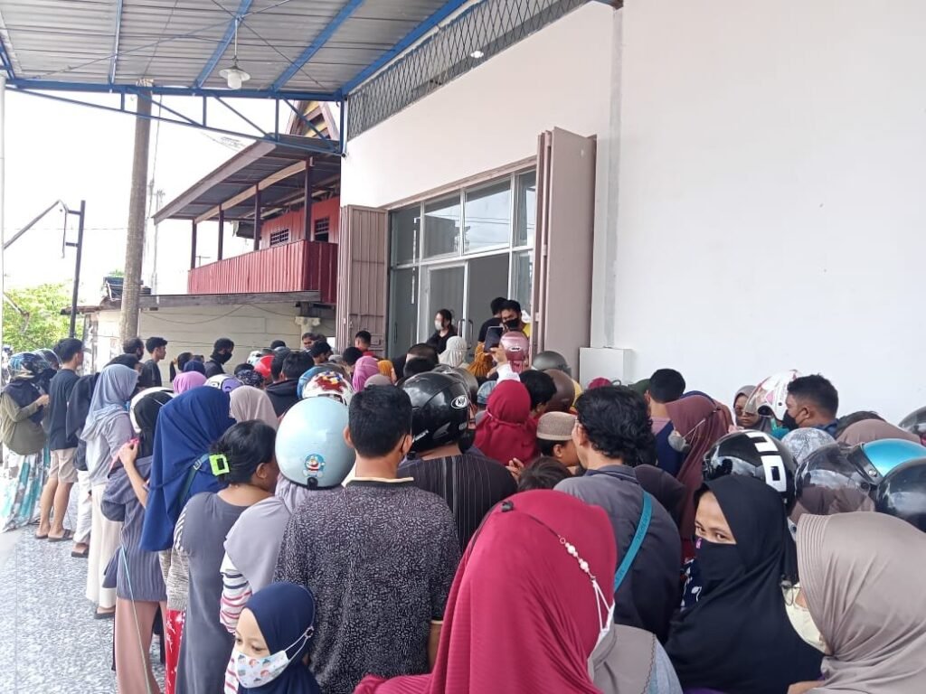 Terlihat, saat pintu toko ditutup, warga yang berdiri paling depan terus mencoba merangsak masuk ke toko tersebut.