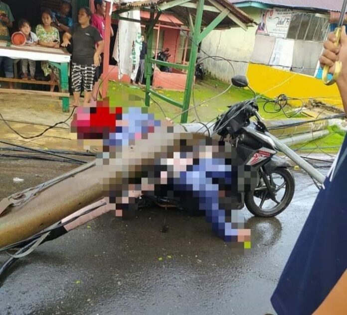 Hujan dan angin kencang yang saat itu melanda kawasan tersebut, membuat satu tiang listrik tumbang dan patah di bagian tengahnya, dan menimpa korban dan motor yang dikendarai saat itu.