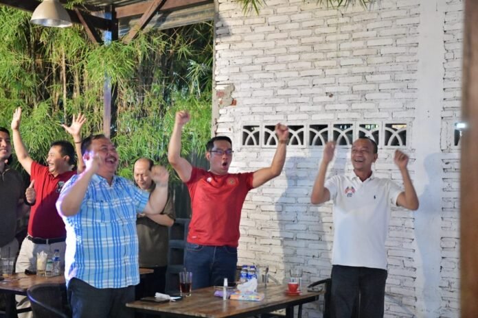 Banda Aceh – Gubernur Jawa Barat Ridwan Kamil menyaksikan laga Semifinal Leg 2 Piala AFF 2020 antara Timnas Indonesia melawan Singapura bersama warga Banda Aceh di sebuah rumah makan di Jalan Panglima Nyak Makam, Sabtu 25 Desember 2021 malam.
